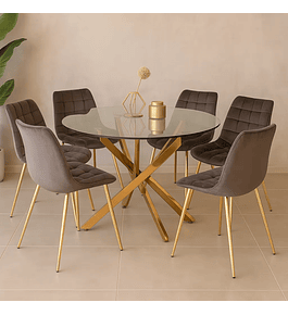 Comedor Kemi Gold redondo vidrio 120 cm con 4 Sillas Capitone Gold