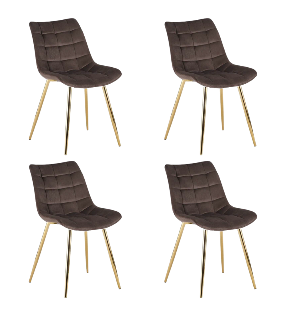 Comedor Kemi Gold redondo vidrio 120 cm con 4 Sillas Capitone Gold, su cubierta es de vidrio templado y patas de metal con terminación en dorado brillante. Tiene topes anti-deslizantes en sus patas que ofrecen estabilidad y permiten ajustar el nivel en cada pata. El tapiz de las sillas es terciopelo y patas de metal en dorado, una combinación explosiva.