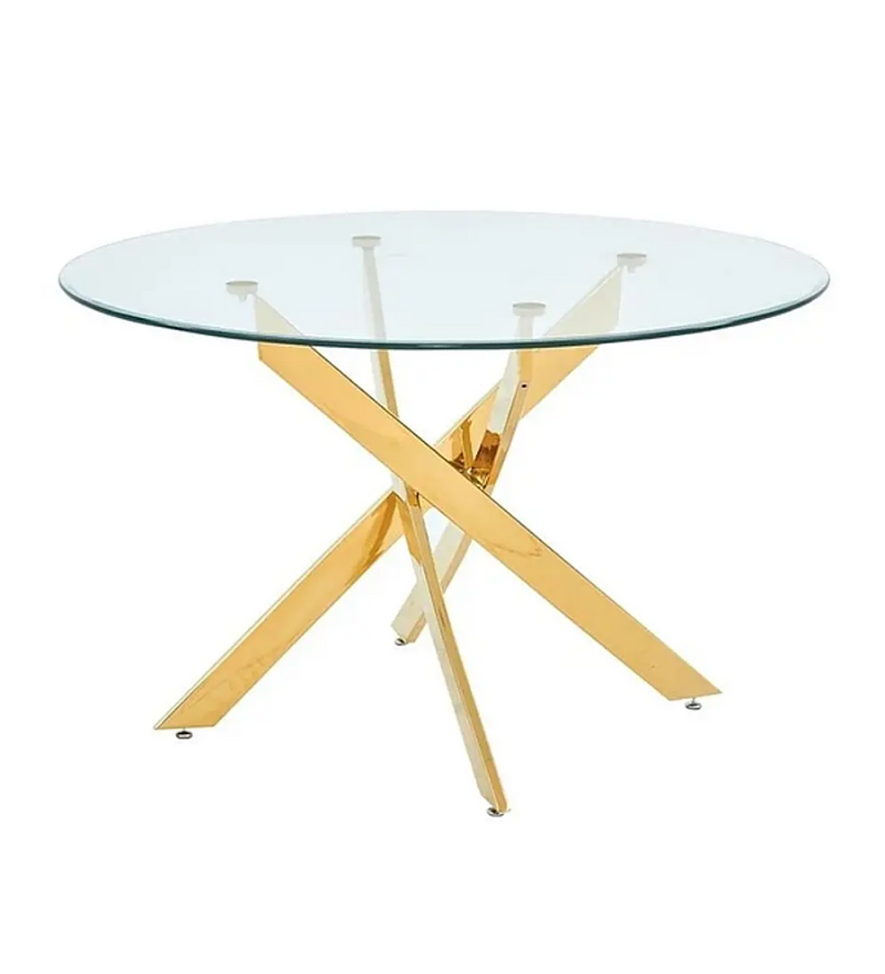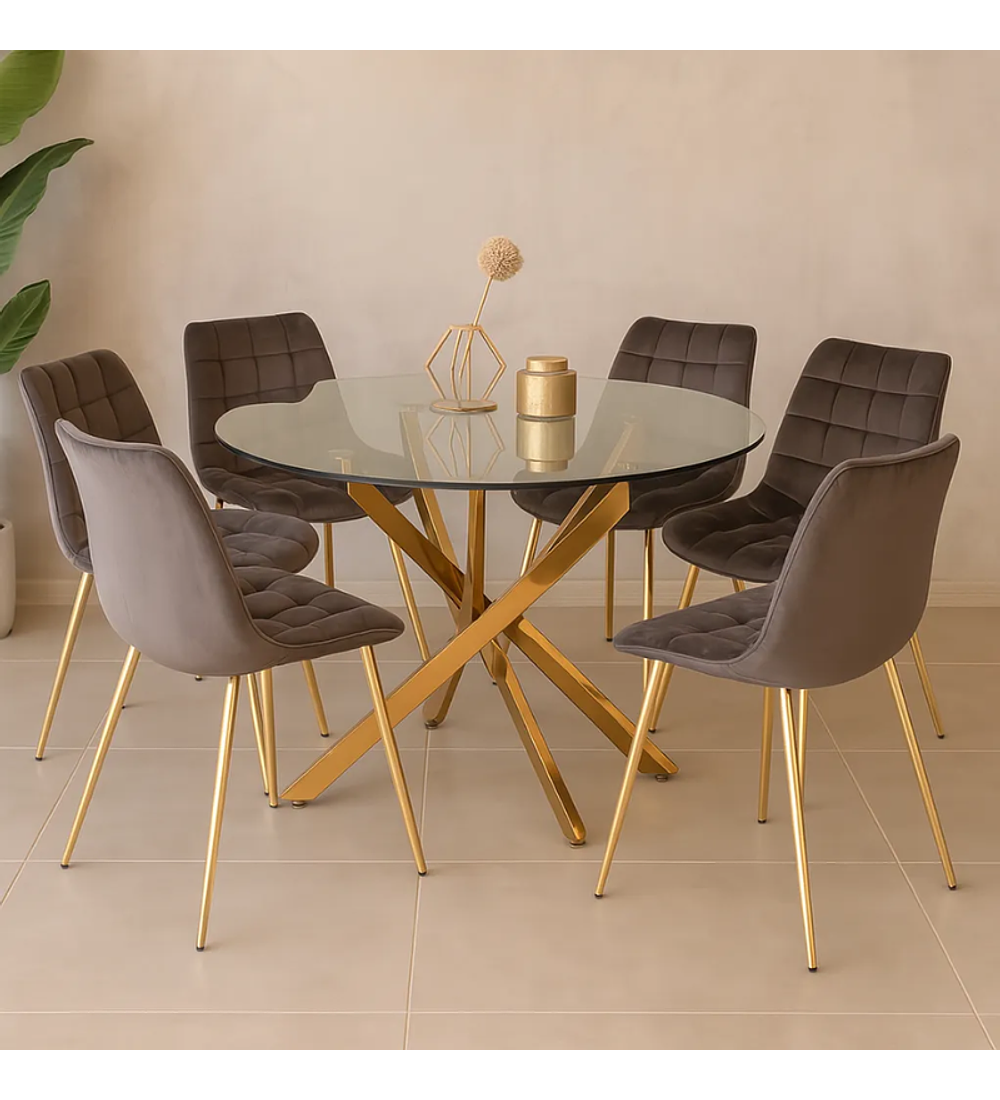 Comedor Kemi Gold redondo vidrio 120 cm con 6 Sillas Capitone Gold