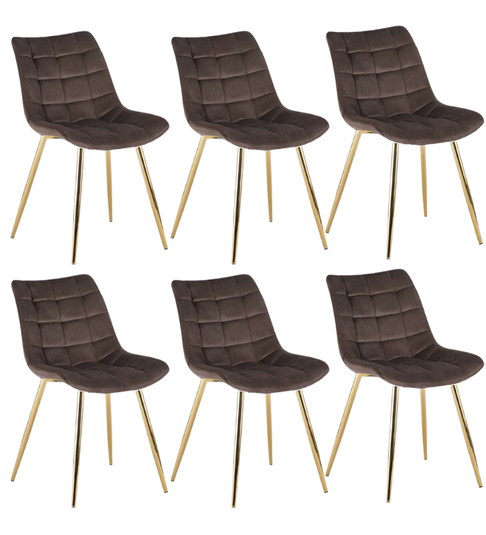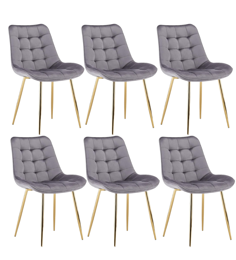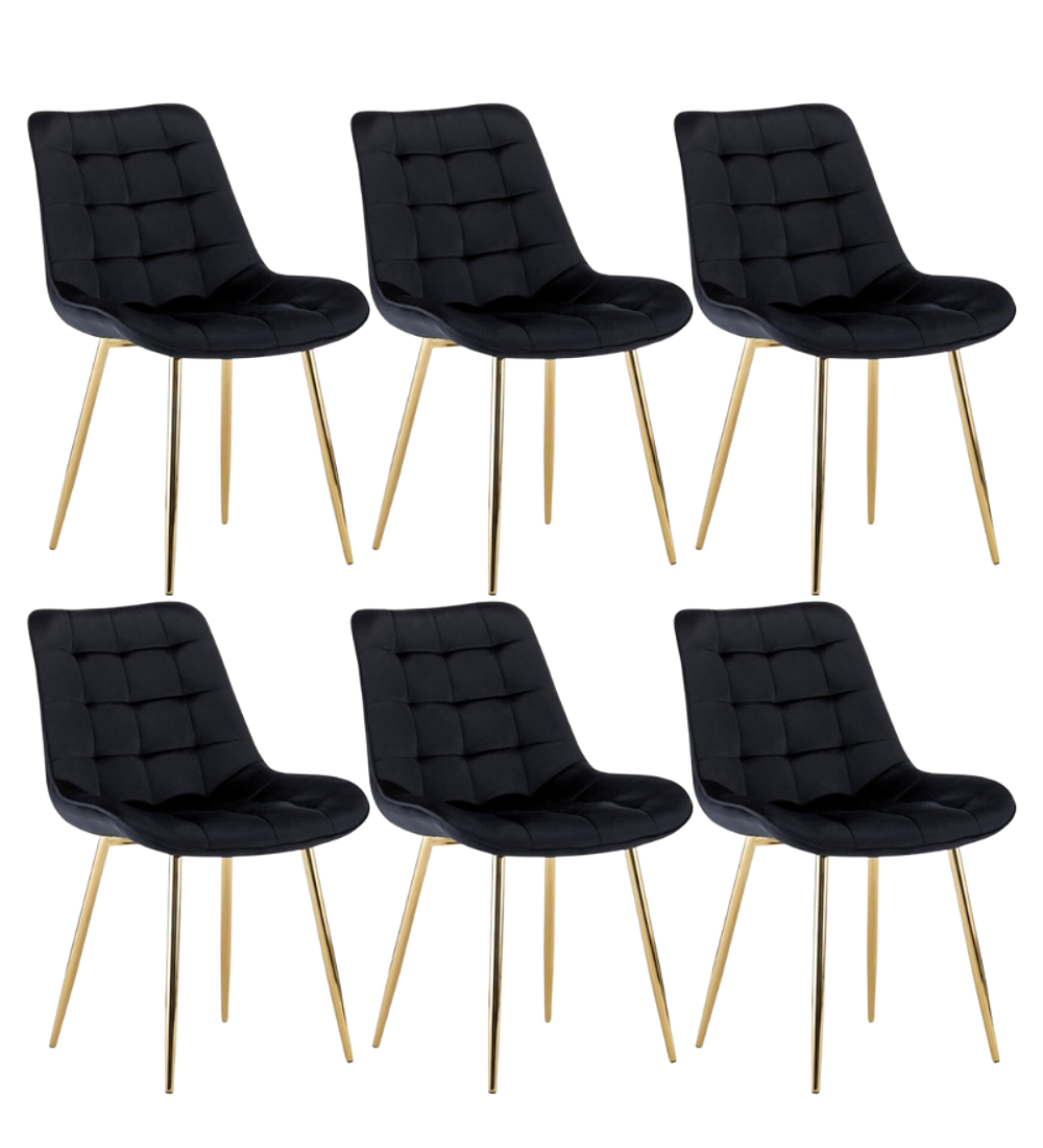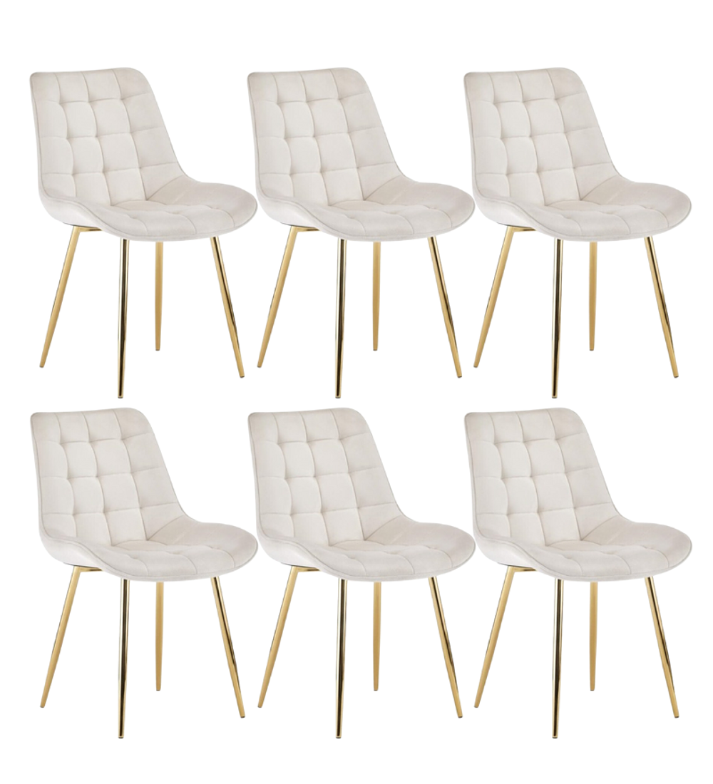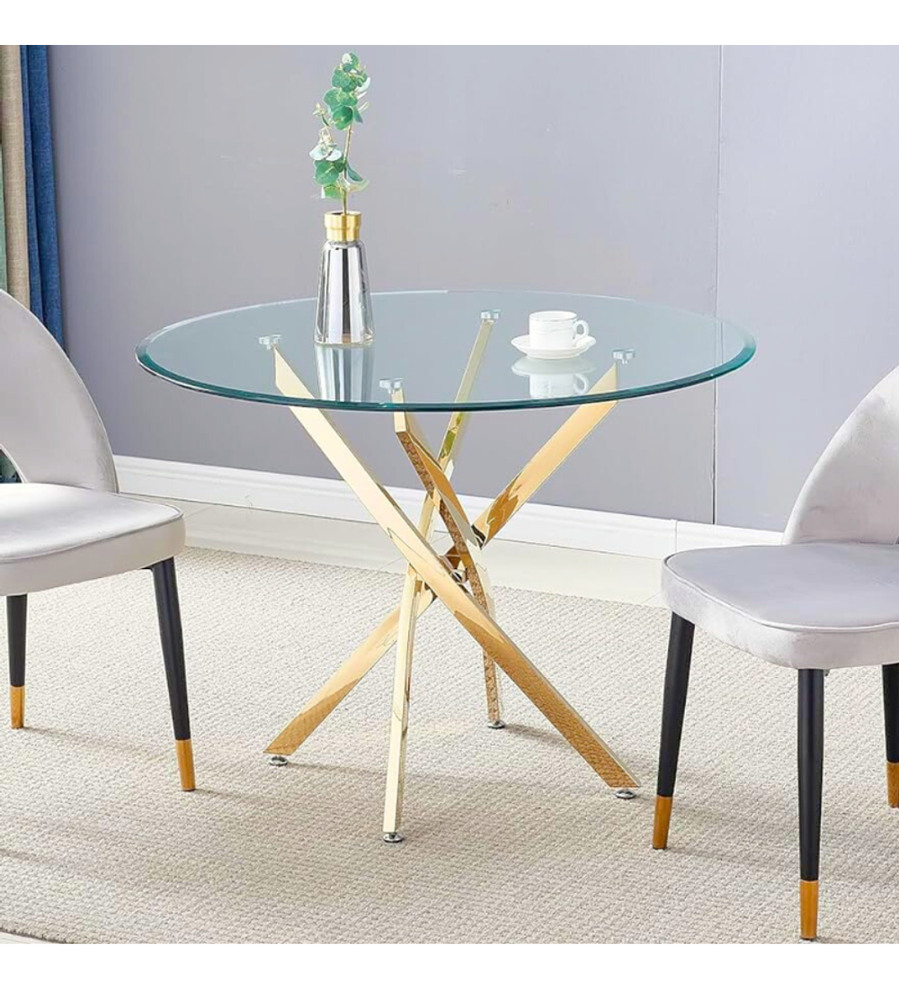 Comedor Kemi Gold redondo vidrio 120 cm con 6 Sillas Capitone Gold, su cubierta es de vidrio templado y patas de metal con terminación en dorado brillante. Tiene topes anti-deslizantes en sus patas que ofrecen estabilidad y permiten ajustar el nivel en cada pata. El tapiz de las sillas es terciopelo y patas de metal en dorado, una combinación explosiva.