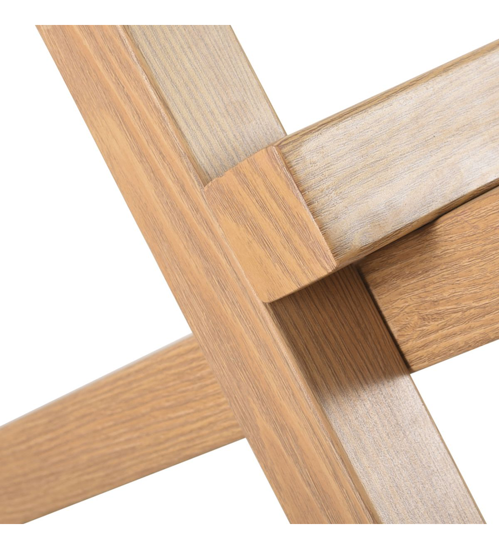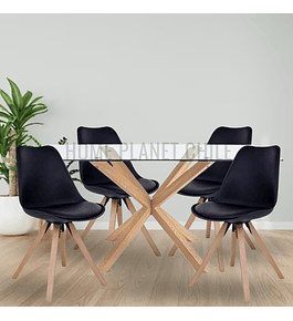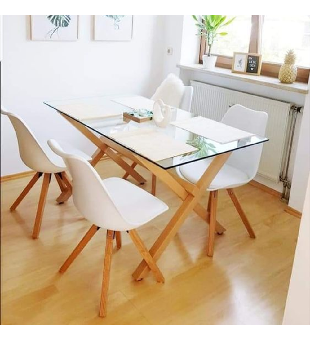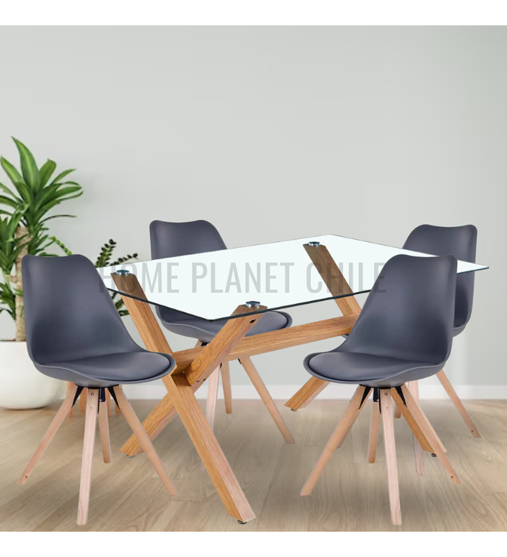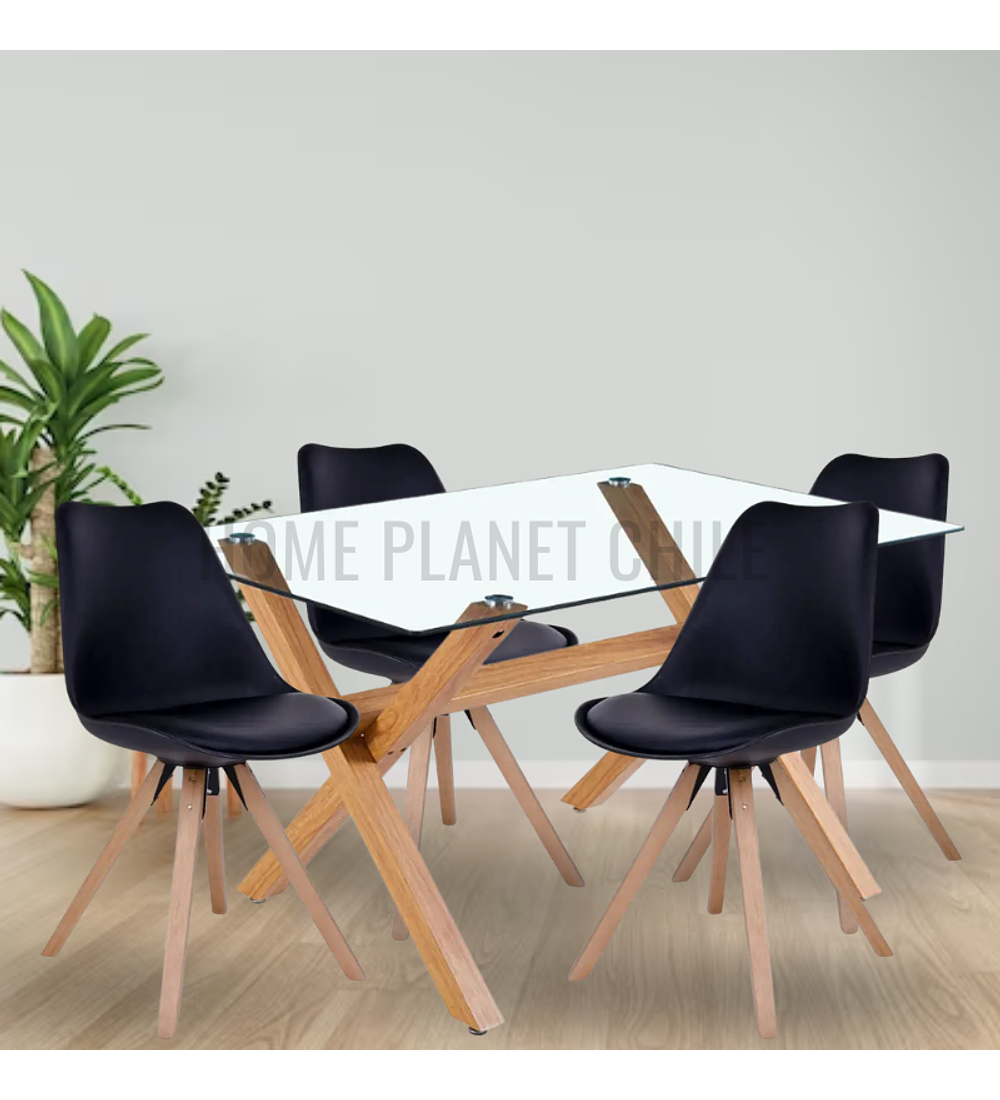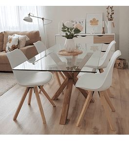Comedor Larvik rectangular vidrio 140x90 cm con 4 Sillas tulip Artic, las patas de la mesa son en forma de "X" de material metal con acabado en color madera, estilizadas y resistentes. Asimismo, las patas de las sillas tulip artic son de madera de haya y base de metal.