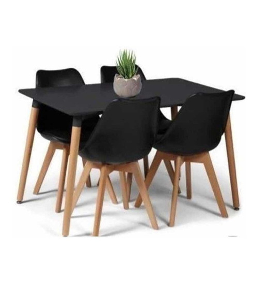 Comedor modelo Bélgica de mesa rectangular en color negro 120x80 cm estilo nórdico, estilo Eames, combinado con cuatro Sillas Tulip. Mesa contiene material base de haya alemana y material de cubierta de MDF.