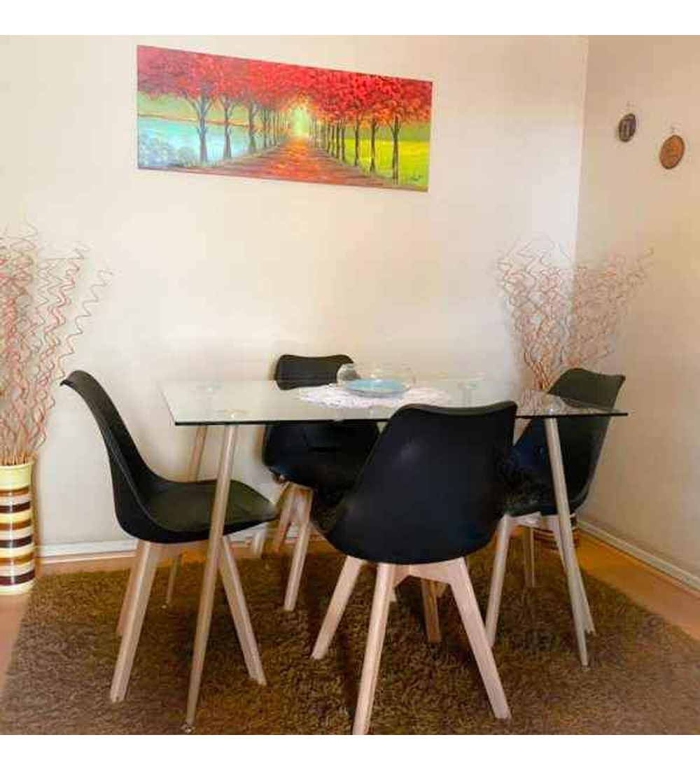 Comedor modelo Bangkok de mesa rectangular de vidrio 120x80 cm estilo nórdico, con patas de metal con acabado en color madera, combinado con cuatro Sillas Tulip (disponibles en varios colores).