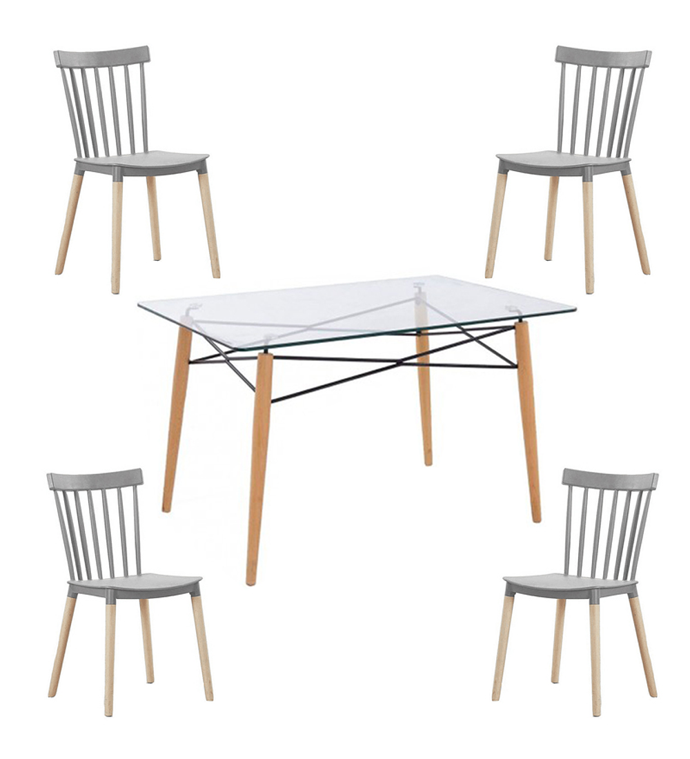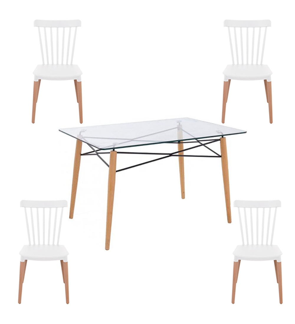 Comedor Rochefort de mesa rectangular de vidrio 140x90 cm con 4 Sillas Windsor. Un fascinante diseño que combina el estilo contemporáneo con la vanguardia.