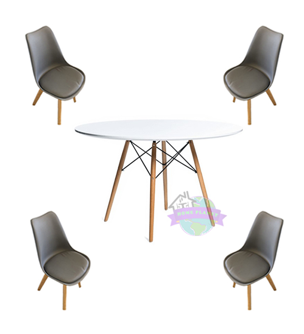 Comedor modelo Taipei con mesa redonda de 100 cm de diámetro, réplica Eames en color blanca. Combinada con cuatro Sillas Tulip (disponibles en varios colores para tí).