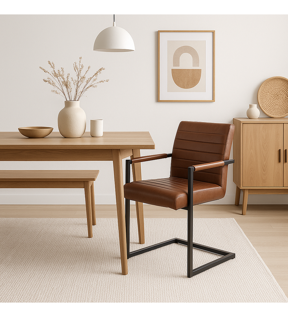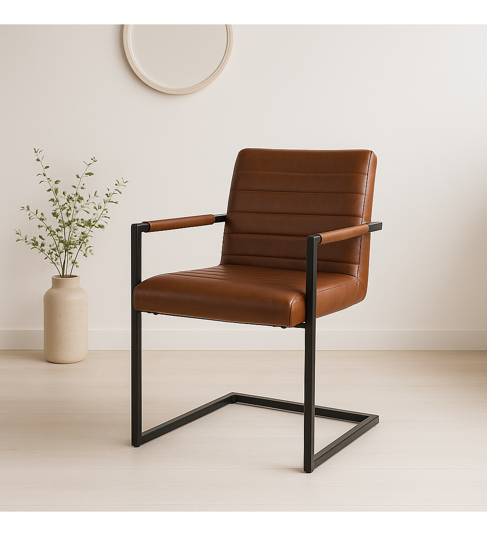 Pack 4 Sillas Industriales de Cuero Sintético, su diseño combina la calidez del cuero sintético con la firmeza de una base metálica negra, creando un look moderno y versátil. La combinación del tono café y negro aporta elegancia y combina fácilmente con distintos tipos de decoración. Añade un toque de sofisticación, eficiencia y elegancia a tus espacios con la Silla Industrial de Cuero Sintético – Café.