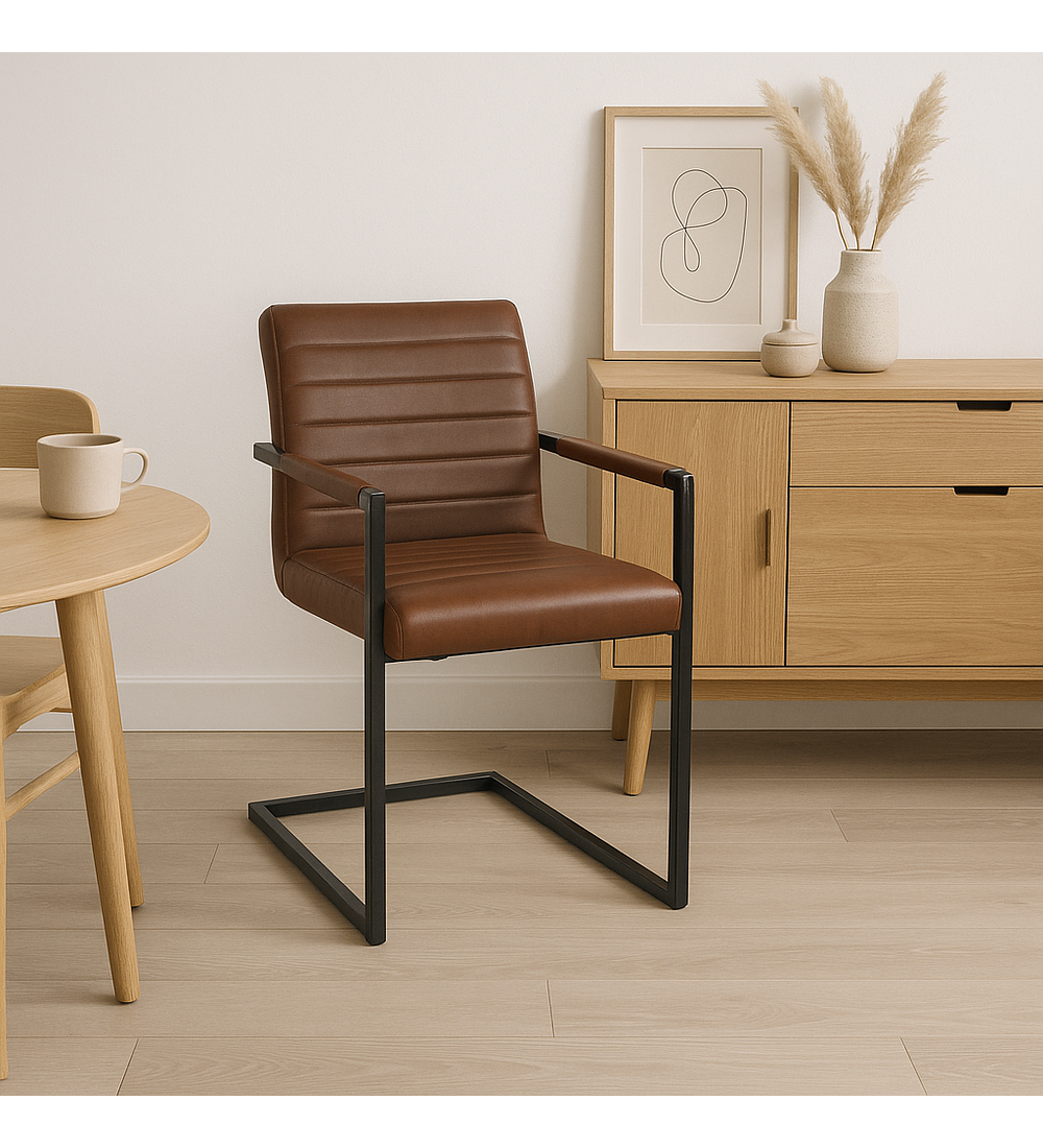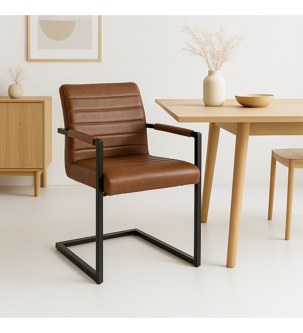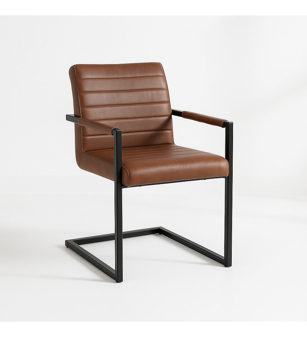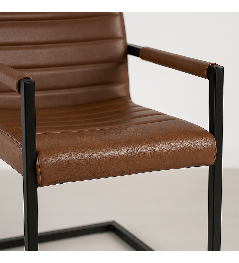 Silla Industrial de Cuero Sintético, su diseño combina la calidez del cuero sintético con la firmeza de una base metálica negra, creando un look moderno y versátil. La combinación del tono café y negro aporta elegancia y combina fácilmente con distintos tipos de decoración. Añade un toque de sofisticación, eficiencia y elegancia a tus espacios con la Silla Industrial de Cuero Sintético – Café.